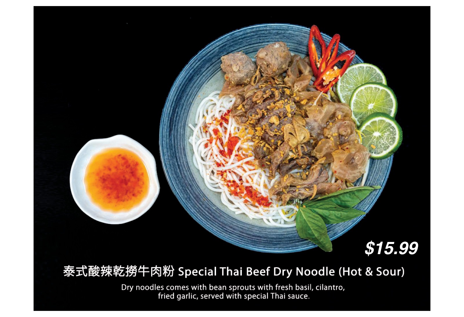 $19.99Dark, flavourful broth with Thai herbs, dark soy sauce & coconut milk. Topped with bean sprouts, basil, cilantro & fried garlic.
